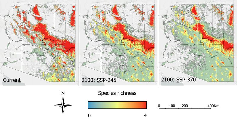 West Nile Virus (WNV) is an arbovirus that infects birds and is spread by Culex mosquitoes. West Nile Virus has been detected in over 250 bird species, with morbidity and mortality of avian hosts varying significantly between clades. Changing climate, land use and biodiversity loss will influence the distribution of both avian hosts and mosquitoes, impacting the spread of vector-borne diseases. To identify potential hotspots of WNV outbreaks, we used MaxEnt species niche distribution modeling and ArcGIS Pro to model the habitat distribution of eleven avian host species of WNV of varying vertebrate host competence indices throughout the state of Arizona. We included eleven environmental and climatic variables influencing habitat use and distribution, such as temperature, rainfall, normalized difference vegetation index, and elevation, and then projected those likely suitable habitats with four Shared Socioeconomic Pathways (SSPs) under two different climate models. Understanding how the distributions of hosts shift under different climatic scenarios will allow both wildlife conservation and public health professionals to identify potential transmission ‘hotspots’ and perform proactive measures to mitigate future outbreaks.